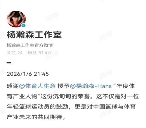 根据杨瀚森工作室在社媒透露的消息,目前国内的权威媒体是授予杨瀚森年度体育产业人物的荣誉。我们也看到了工作室第一时间在社交平台发文,感谢了权威媒体授予小杨这个奖项,并且表示这是一份沉甸甸的荣誉和肯定,也是对杨瀚森这位年轻球员的鼓励。希望杨瀚森接下来能够继续努力,将来成为我们中国男篮的荣光。